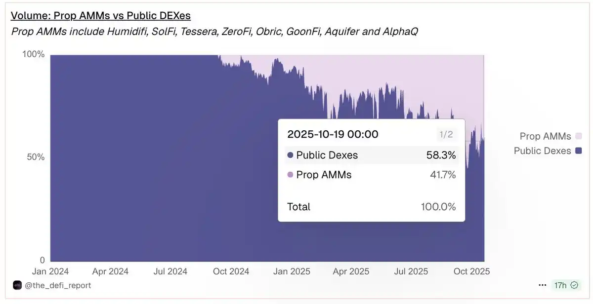 Proprietary Automated Market Makers (Prop AMMs) are quickly becoming the dominant force in the Solana DeFi ecosystem, currently contributing over 40% of the trading volume in major pairs. These liquidity venues operated by professional market makers can provide deep liquidity and more competitive pricing. The key reason is that they significantly reduce the risk of market makers being exploited for "stale quotes" to conduct front-running arbitrage.