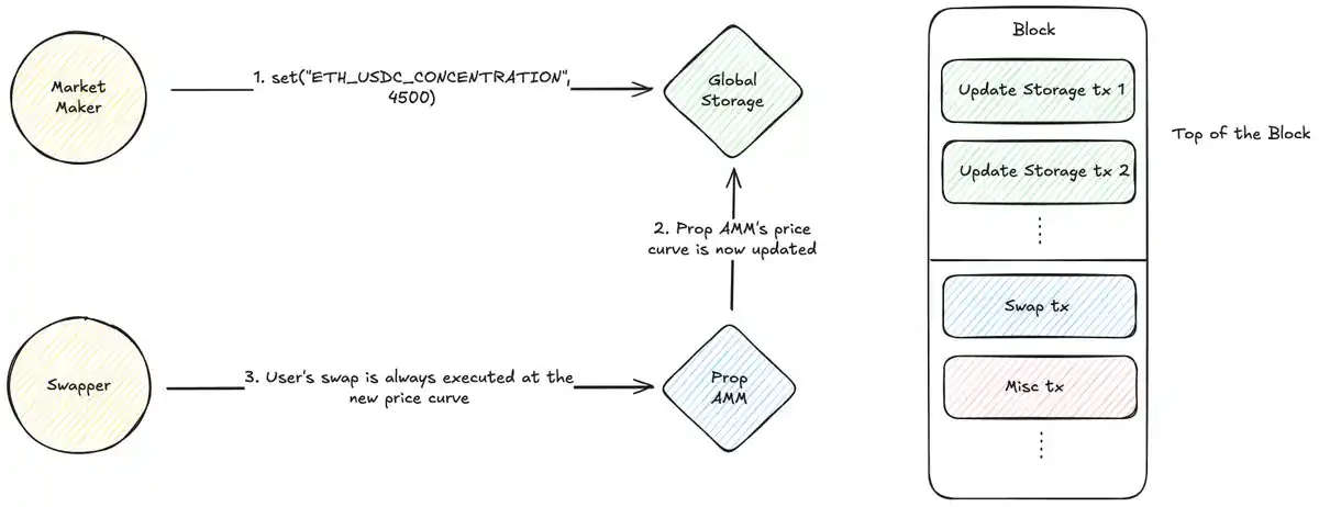 While the standard EVM architecture makes such operations costly and risky, new designs offer different approaches to solve this problem. By combining on-chain global storage smart contracts and off-chain builder strategy in the new design, a dedicated "fast lane" can be created to ensure top-of-block execution of updates, while establishing a local, controlled fee market. This not only makes Prop AMM viable on the EVM but may also revolutionize all EVM DeFi relying on block top oracle updates.