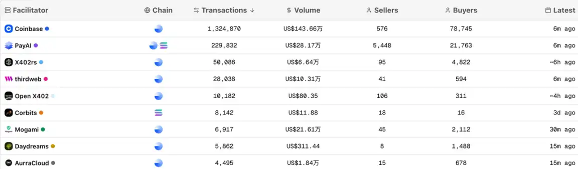 By transaction volume, PayAI has become the largest x402 Facilitator outside of Coinbase, supporting multiple networks such as Base, Solana, Polygon, and more. As of the time of writing, PayAI has processed 13.78% of the total x402 transaction count and accounts for 13.27% of the total transaction volume. In contrast, Coinbase's market share of transaction volume has dropped to approximately 80%.