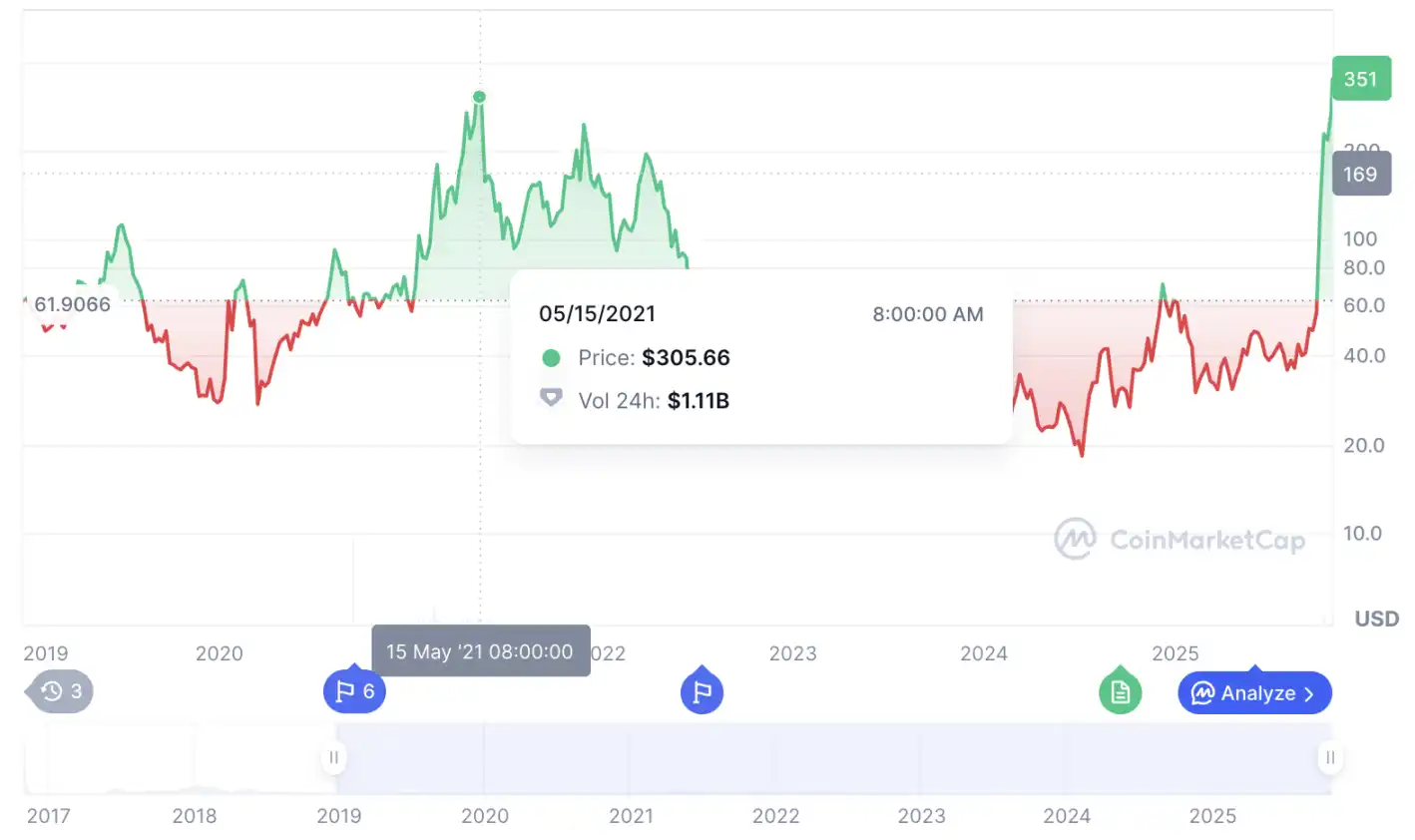 This price is 11.5% higher than the $319 closing price on May 8, 2021, but according to CoinGecko data, it is still 88% lower than the historical peak of $3191.93 set nearly nine years ago.