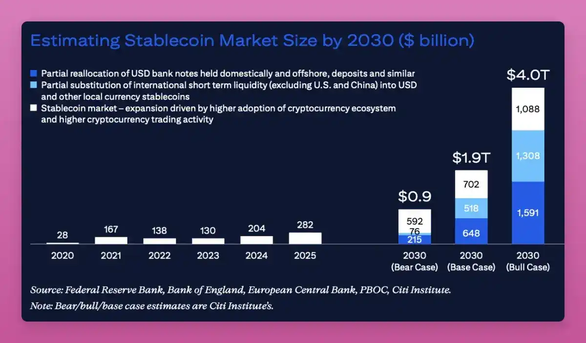 While USDT's dominance has dropped from 67% to 60%, its market cap is still growing. Citibank predicts that the stablecoin market cap could reach $19 trillion to $40 trillion by 2030.