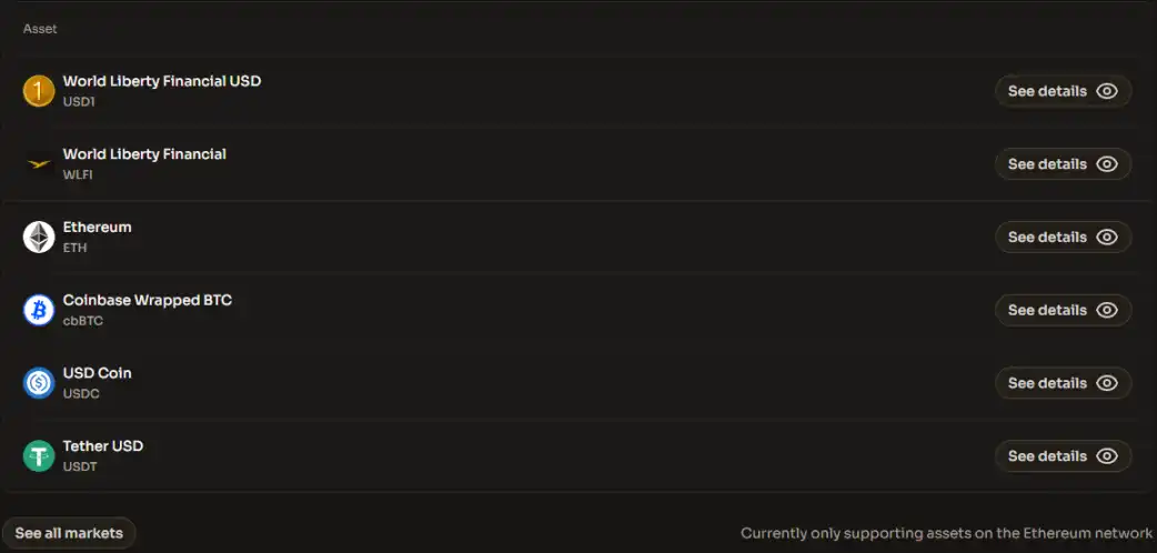 World Liberty Markets is positioned as a lending market revolving around USD1. Users can not only deposit assets on the platform to earn interest but also use their held assets as collateral to borrow other tokens.