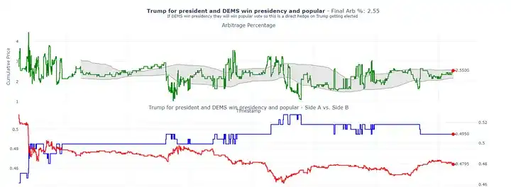 This strategy currently shows a 2.55% arbitrage opportunity. In this combination, we are betting on Trump's victory on one hand and hedging by betting on the Democratic Party winning both the popular vote and the presidency. While this is not a perfect hedge (as the Democratic Party could potentially win the presidency without winning the popular vote), according to my model, the probability of this scenario is extremely low. Therefore, I believe this hedge structure is robust.