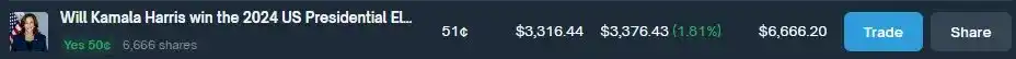 In this trade, I have bought the "No" option on all possible outcomes of the popular vote. Currently, the arbitrage opportunity for this trade is 6.65%.