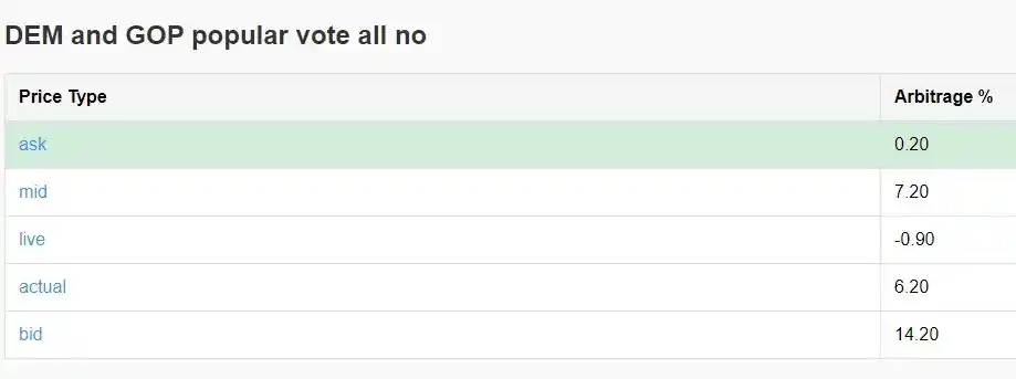 Arbitrage 3: Buying "No" on all outcomes of the Democratic and Republican popular vote