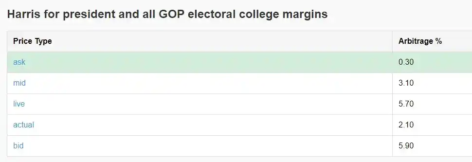Arbitrage 1: Buy "Harris Elected President" and Simultaneously Buy All "Republican Wins Different Elector Margins" Outcomes