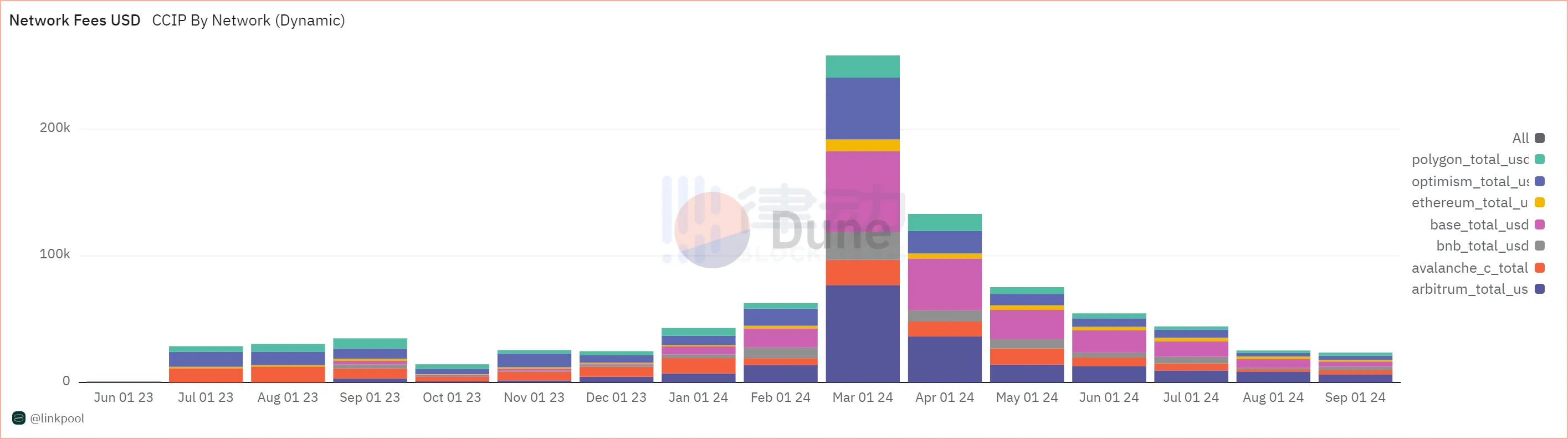 According to Dune data, CCIP uses Cross-chain fees as its main source of business income, and is mainly contributed by mainstream L2s such as Arbitrum, Base, and Optimism. Cross-chain income depends largely on the market's prosperity and is sensitive to market reactions. In March of this year, its cross-chain income peaked at about US$258,000 under the favorable catalysis of the approval of BTC ETF. After the on-chain market cooled, Q2 revenue decreased by 30%, and reached an extreme freezing point in the Q3 market, with revenue falling again by 70% and finally maintaining at $25,000 per month.