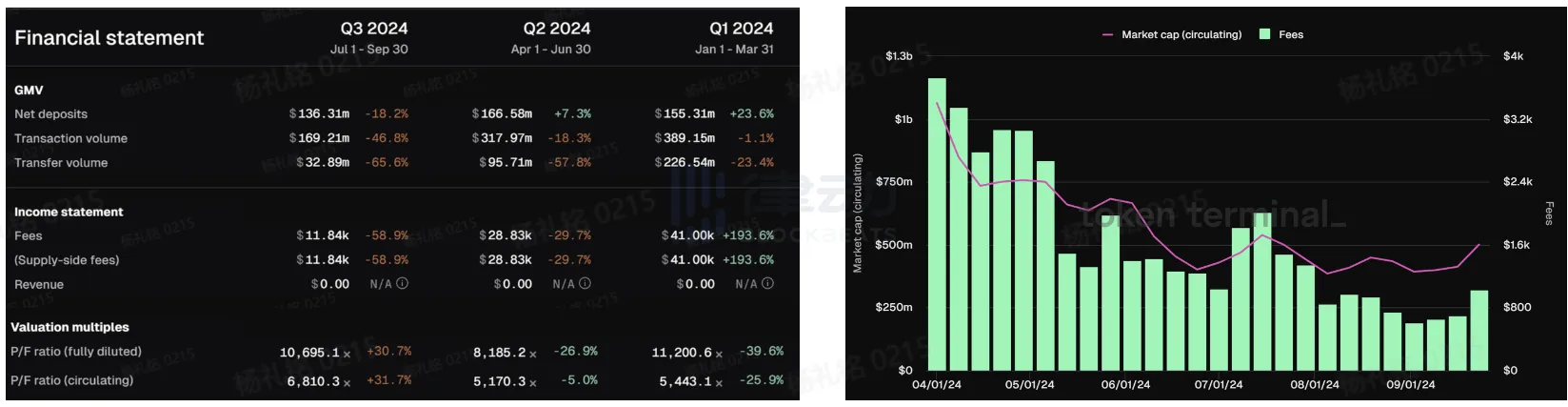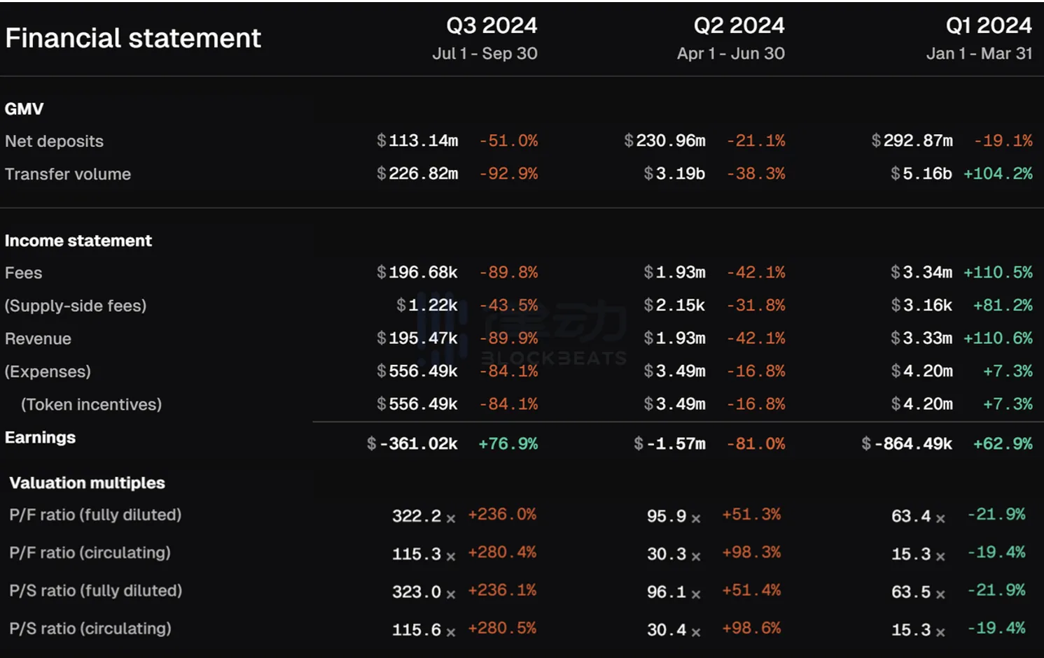 From 2024Q1 to 2024Q3, whether in terms of transaction volume or cross-chain fees, Axelar's various indicators denominated in US dollars are not optimistic, with a sharp drop of more than 50% year-on-year, showing an accelerating downward trend. From the perspective of price-earnings ratio, Axelar's P/F ratio in the third quarter did not decrease but increased. The main reason is that its market value has declined by about 30%, which is less than the halving of cross-chain fee revenue, so the P/F ratio is generally inflated.