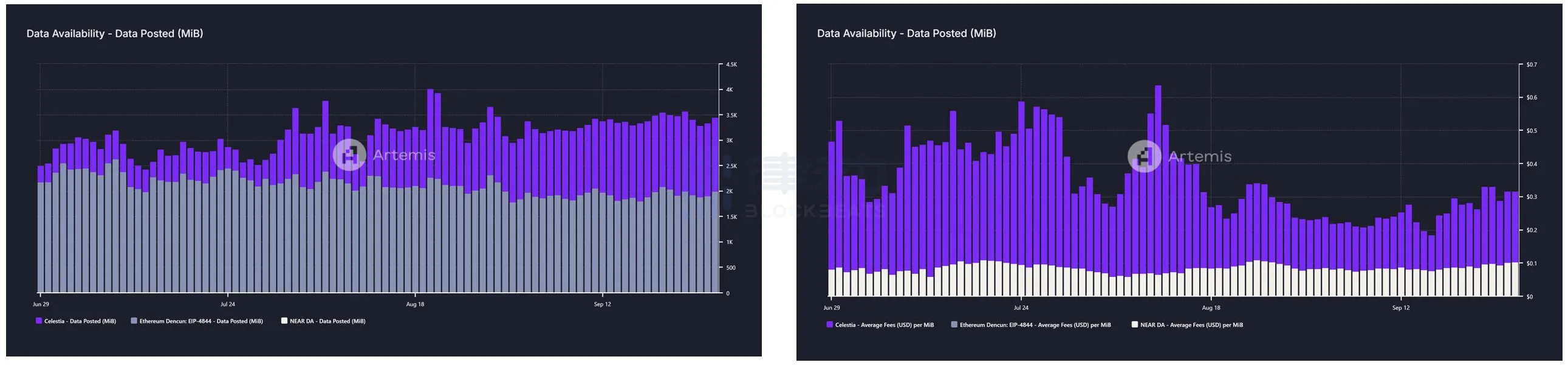 Left: Celestia/Ethereum Data Post; Right: Celestia/Ethereum average cost per MiB, data source: Artemis