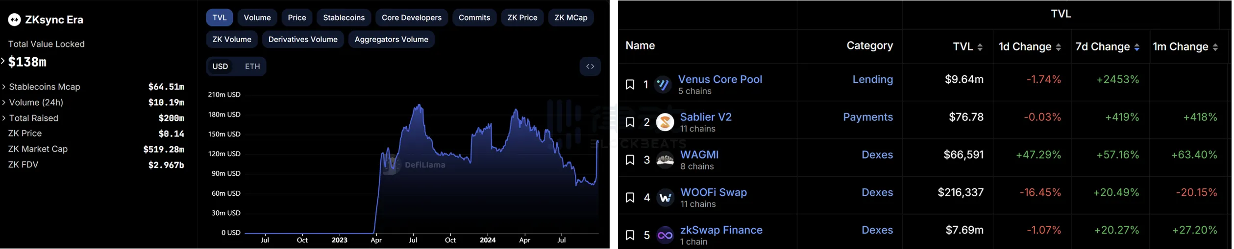 Obviously, zkSync has realized the problems of weak ecology and loss of existing users in the fierce L2 competition. zkSync's TVL has doubled from 76 million to 140 million since September 20. The recent changes in TVL are mainly contributed by Venus Core Protocol, which increased by 2434% in one week. At the same time, zkSync has recently become the third L2 in terms of weekly active users, but there is still an order of magnitude difference with Arbitrum and Base. Although zkSync has been catching up recently, it still has a long way to go.