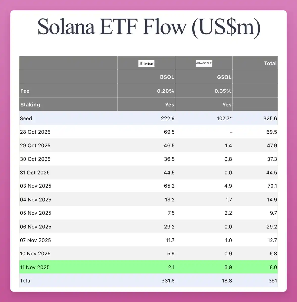SOL is entering the same institutionalized stage as ETH. Last month, a SOL spot ETF appeared on CT, with no hype. Although the inflow volume is not particularly high (totaling $3.51 billion), there is a positive inflow every day.
