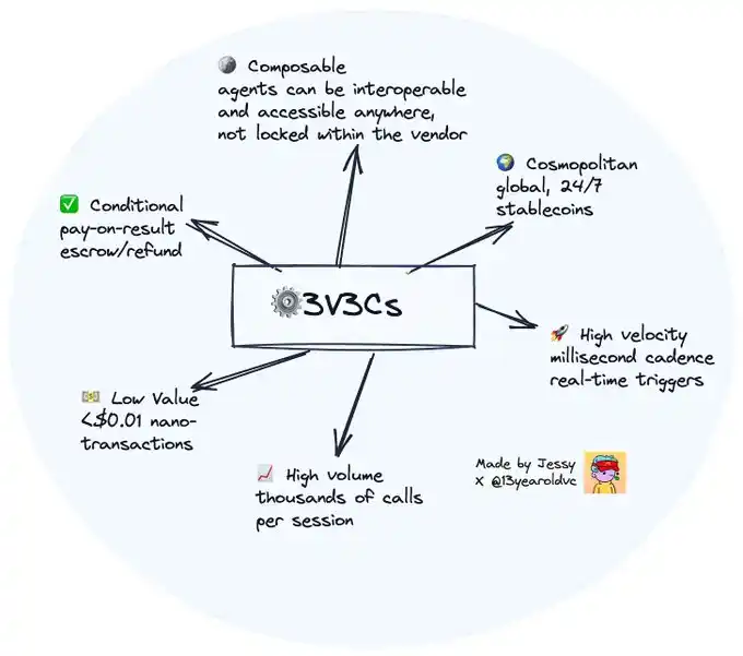 Whether on the consumer side or the enterprise side, we will see some new user behaviors that were previously impossible: complex, condition-triggered transactions that adhere to the "3V3C" model, executed automatically by agents in the background. Particularly as Large Language Models (LLMs) become more intelligent and operating costs decrease, the cost savings from these transactions will far exceed the required token fees.