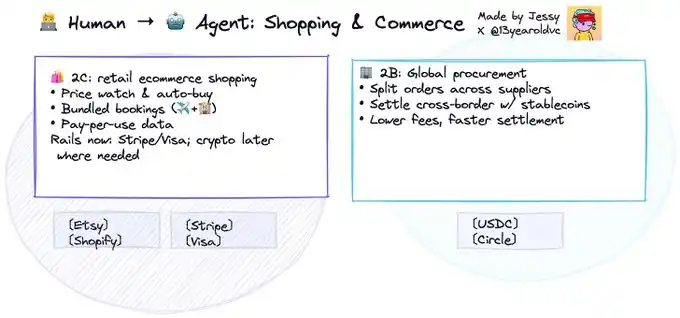 In the short term, most of these payment processes will still be completed through traditional channels like Stripe or Visa—this is not a problem. For retail e-commerce (2C), existing infrastructure is sufficient to support the "Human → Agent" interface, at least for now.