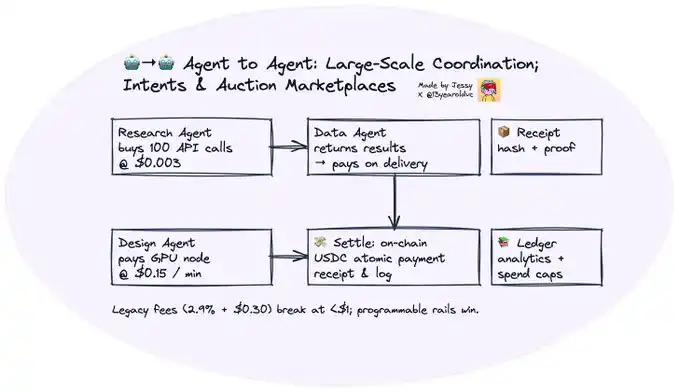 Imagine a research agent purchasing 100 API calls from a data agent; a design agent paying a computing node for GPU usage time. These are all machine-to-machine transactions, high in frequency and low in amount.