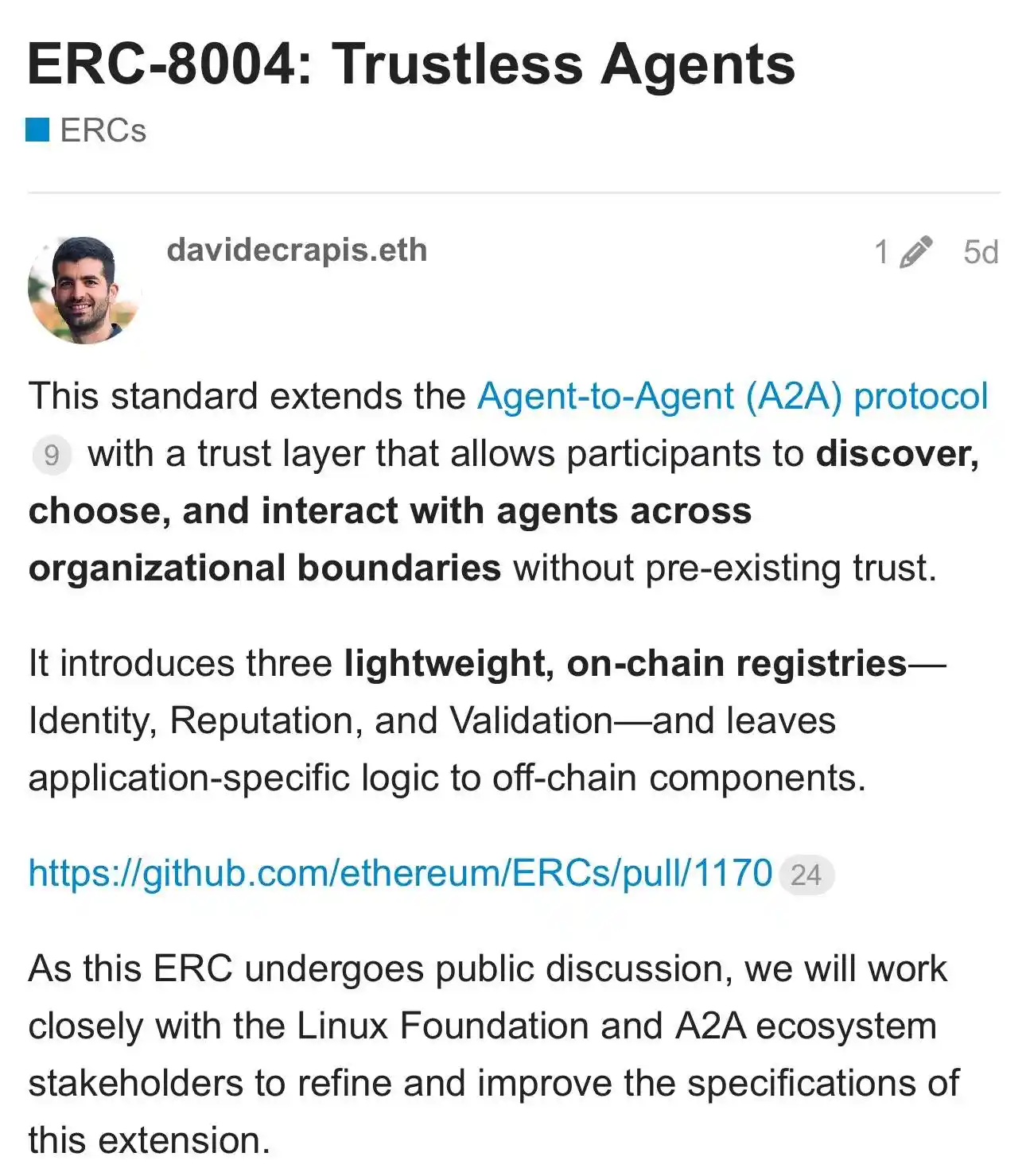 What's even more interesting is that one of the proposers of ERC-8004, Davide Crapis, Head of the Ethereum Foundation's dAI team, revealed a detail in a September interview with Decrypt: