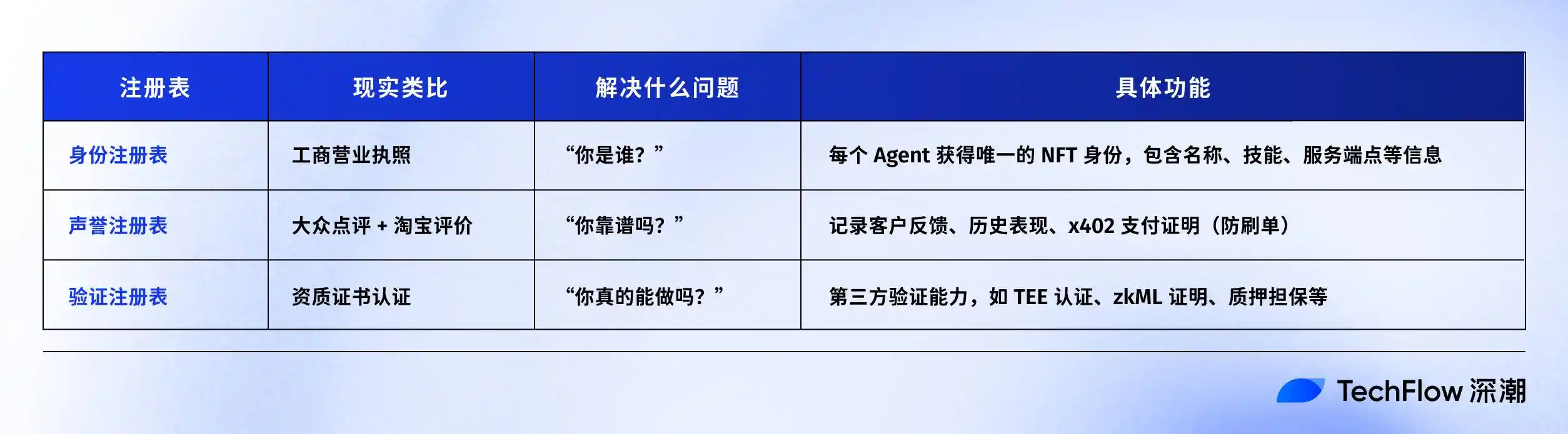 · Identity Registry where each AI Agent receives an ERC-721 token as proof of identity. Yes, you read that right, AI Agents have been NFT-ized. This means an Agent's identity can be viewed, transferred, and even traded in any NFT-supporting wallet.